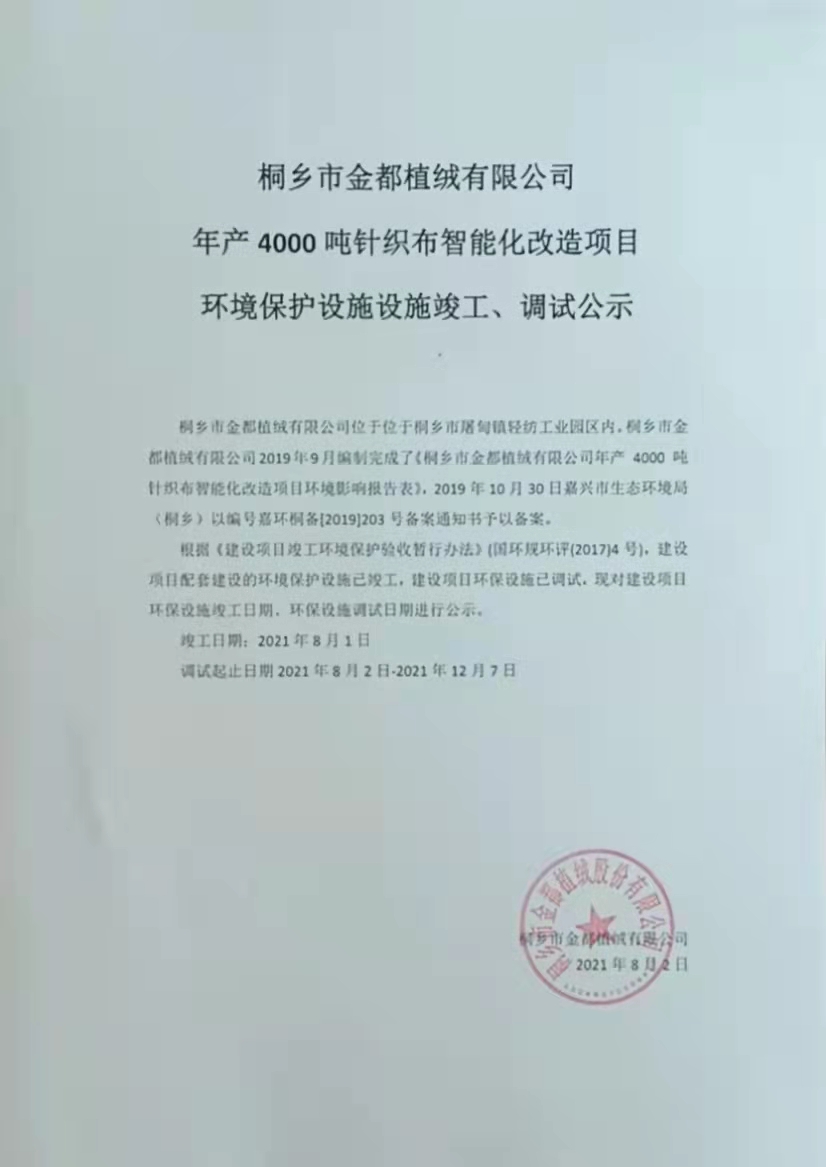 桐鄉(xiāng)市金都植絨有限公司 年產(chǎn)4000噸針織布智能化改造項(xiàng)目 環(huán)境保護(hù)設(shè)施設(shè)施竣工、調(diào)試公示