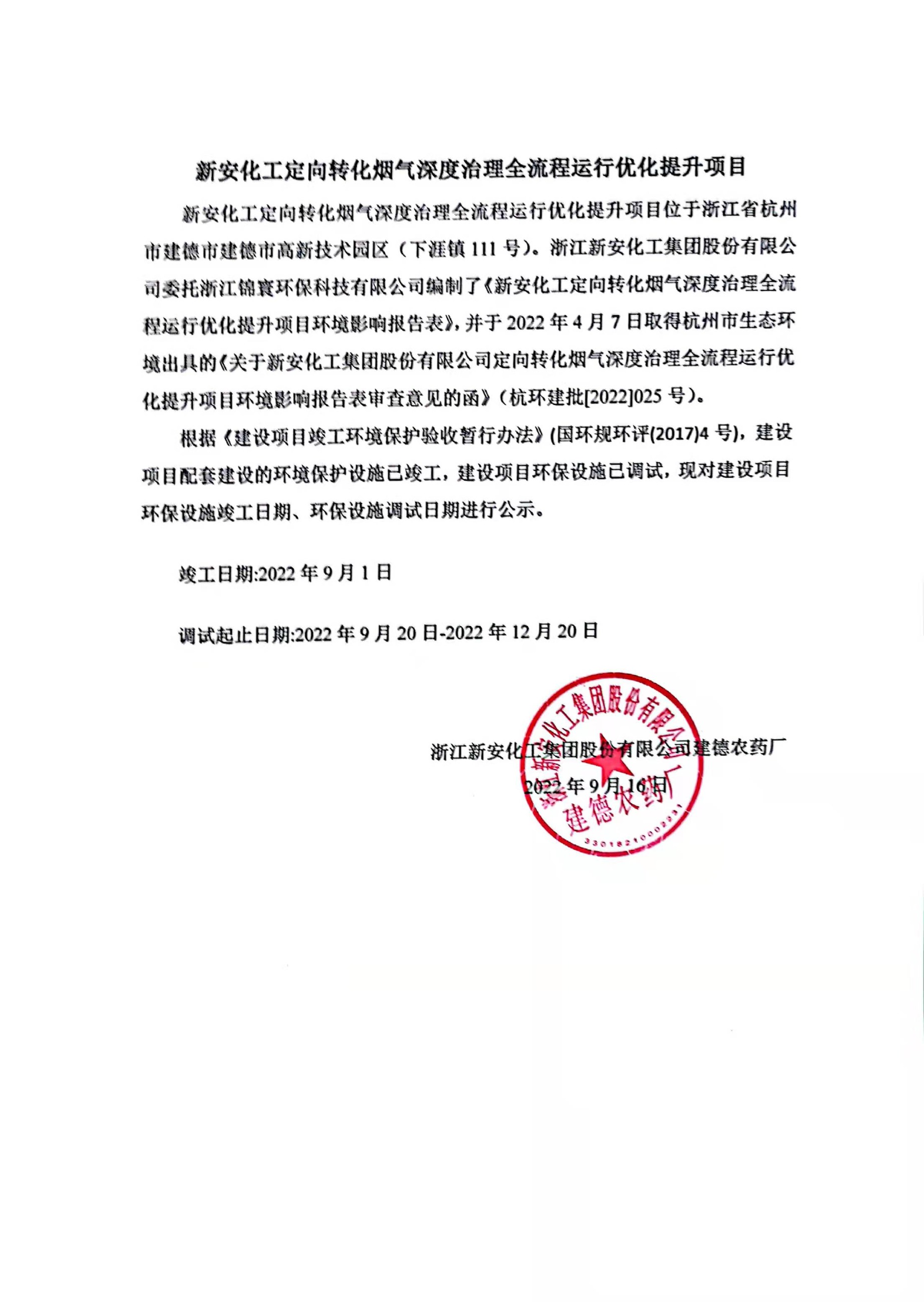 新安化工定向轉(zhuǎn)化煙氣深度治理全流程運行優(yōu)化提升項目環(huán)保設(shè)施竣工、調(diào)試公示