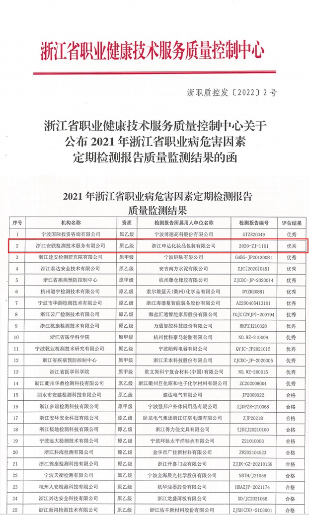 安聯(lián)檢測在浙江省職業(yè)健康技術(shù)服務(wù)質(zhì)量控制中心組織開展的“2021年度浙江省職業(yè)病危害因素定期檢測報(bào)告質(zhì)量監(jiān)測工作”中,從全省47家職業(yè)衛(wèi)生技術(shù)服務(wù)機(jī)構(gòu)(5家原甲級機(jī)構(gòu)和42家原乙級機(jī)構(gòu))脫穎而出,抽查評價(jià)結(jié)果為優(yōu)秀。